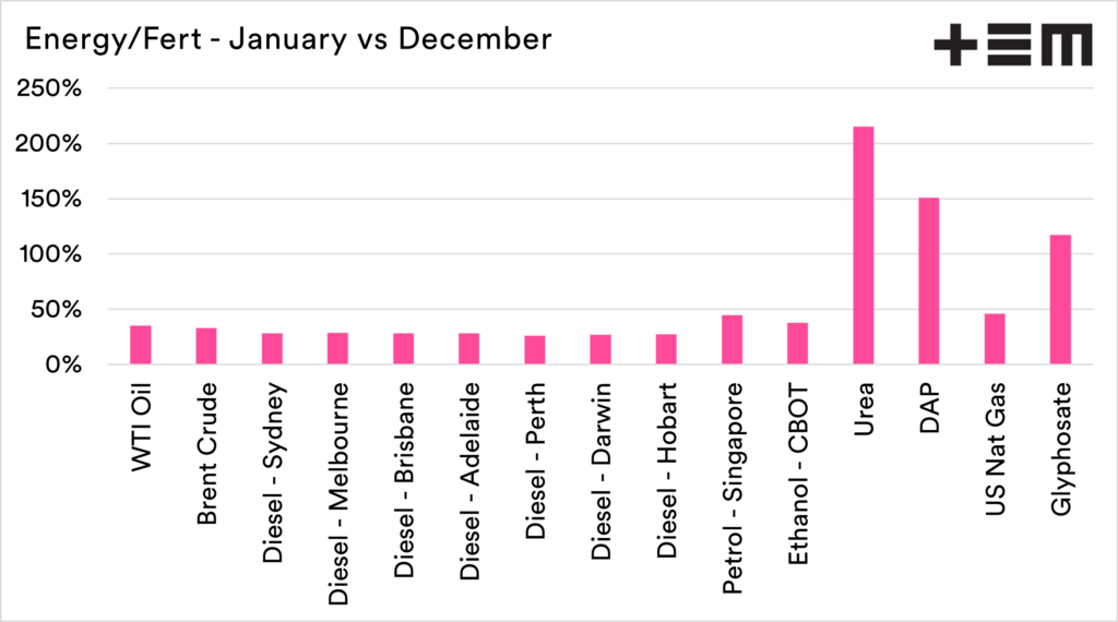 Fuel costs in Australia are up on average 28%, which has increased the cost of operating this harvest. The big-ticket item and one I have discussed throughout the year is fertilizer. Since January, we can see a 215% rise in Urea and a 150% rise in DAP/MAP.