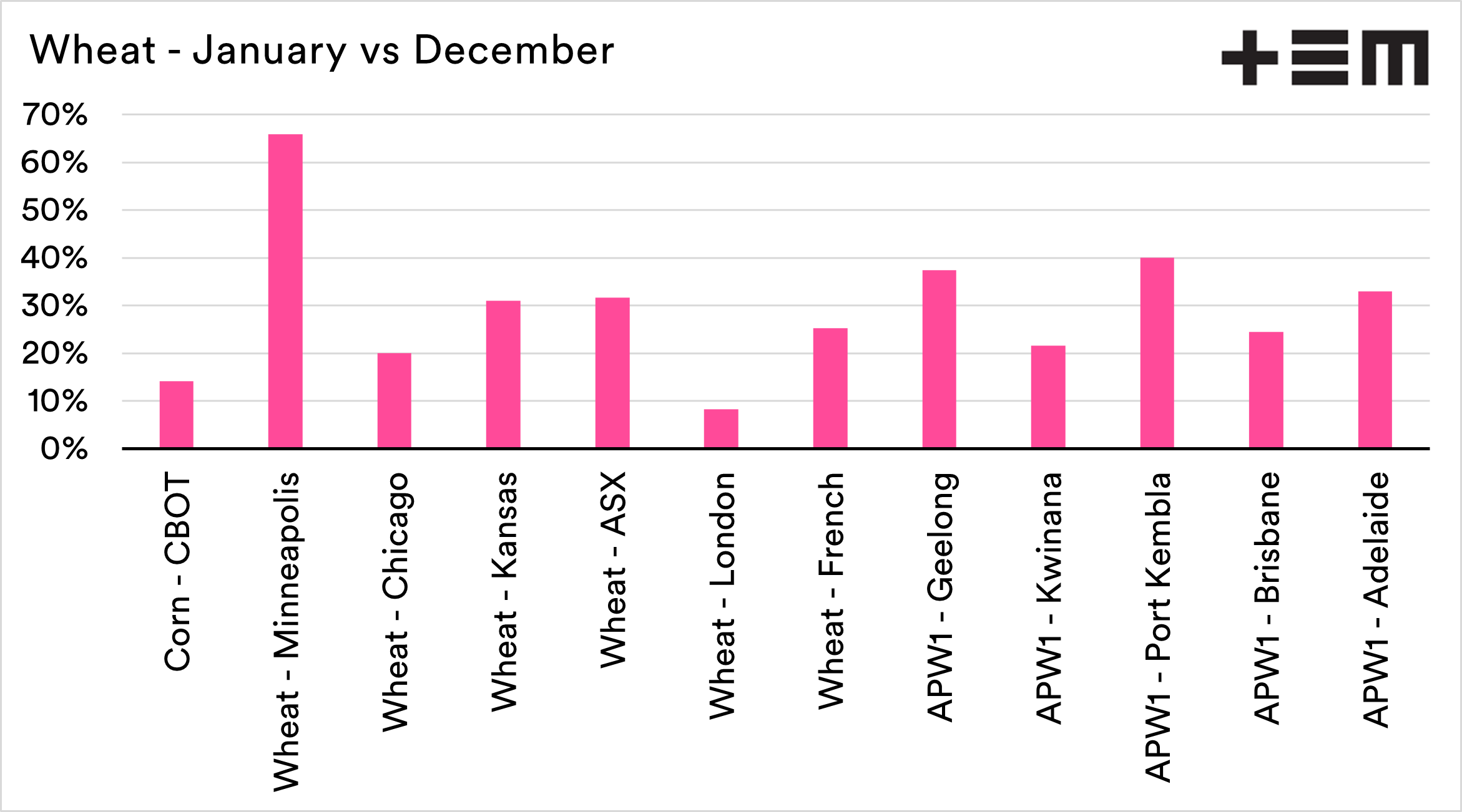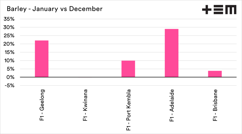 The barley price has been a mixed bag. Adelaide has had a strong performance percentage-wise, whereas Kwinana is largely unchanged.