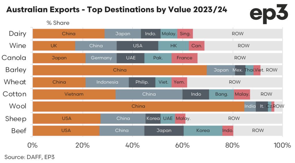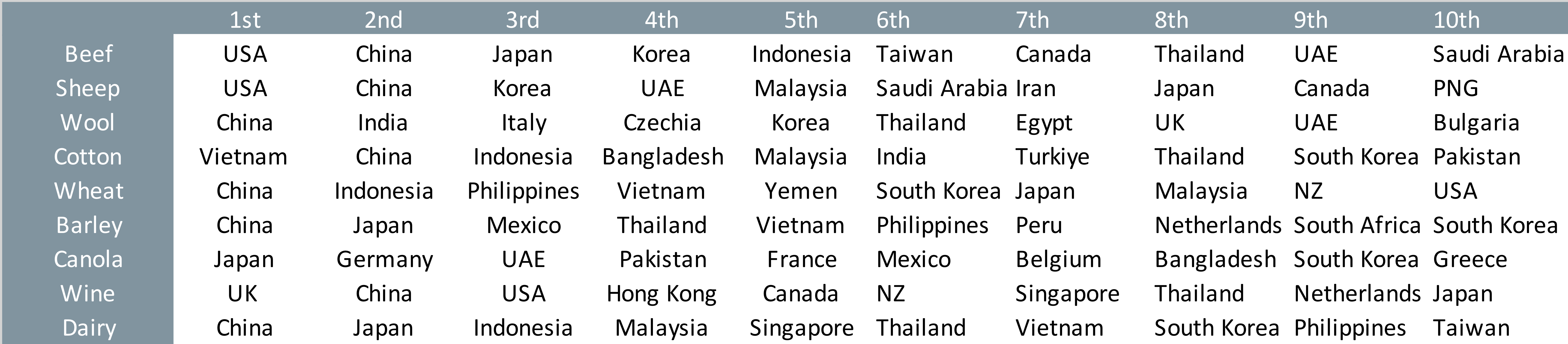 Unsurprisingly, China features prominently in most commodity export markets for Australia sitting in first or second place for all agricultural exports markets listed, with the exception of the Canola category.