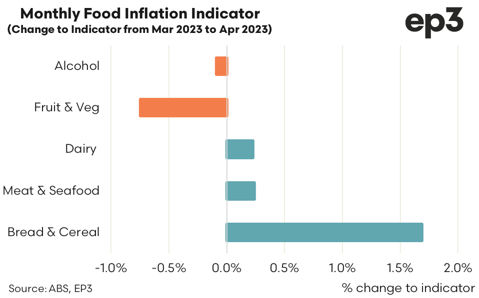 The Australian Bureau of Statistics (ABS) monthly inflation indicators were released today for the period ending in April 2023. The Bread & Cereal category saw the biggest price gains over the month, from March to April, with a lift in the indicator of 1.7%. Dairy, Meat & Seafood categories saw marginal price increases over the month of 0.2%, apiece. Meanwhile, Alcohol prices were down by 0.1% (cheers!) and the Fruit & Vegetable category saw a 0.7% decline.