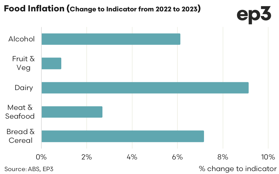 Fruit & Vegetables are the least inflationary so far in 2023, on an annual basis, with prices up by just 0.8%. Meanwhile, the Meat & Seafood category falls within the Reserve Bank of Australia’s target 2-3% inflationary range sitting at 2.6% for the 2023 season, thus far.