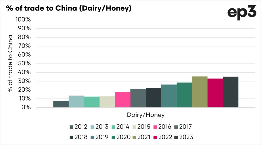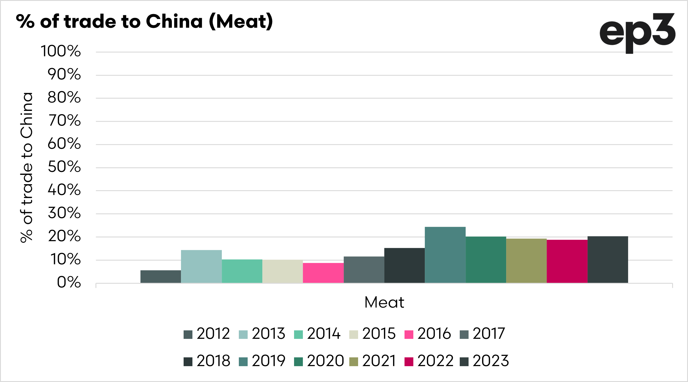 - All of our agricultural commodities not impacted by government action have seen increases in percentage sent to China compared to ten years ago.
