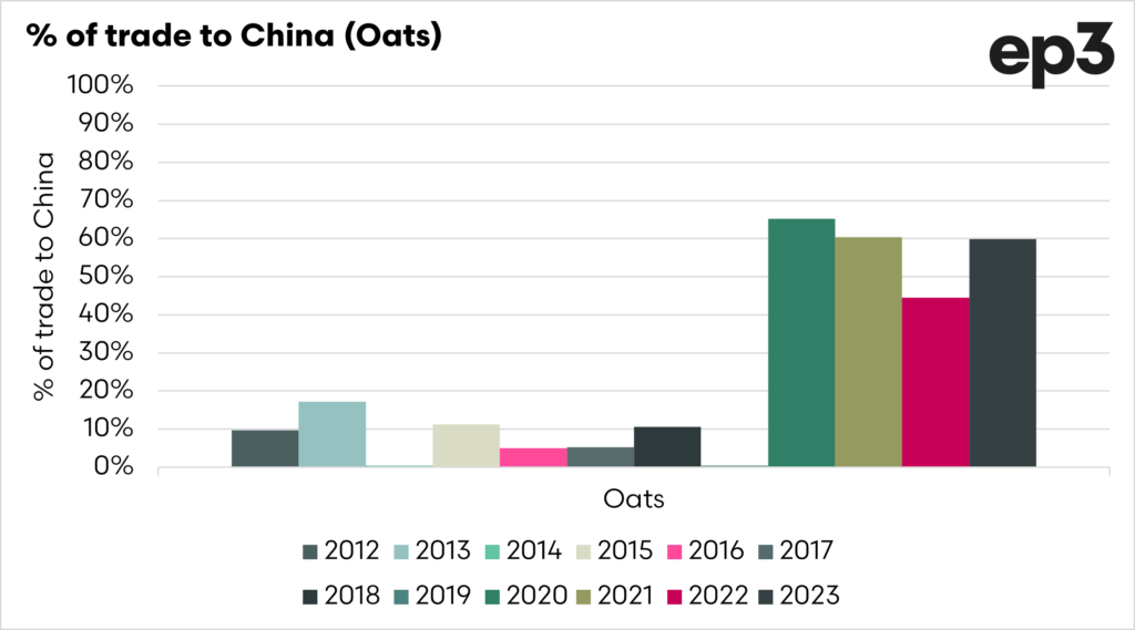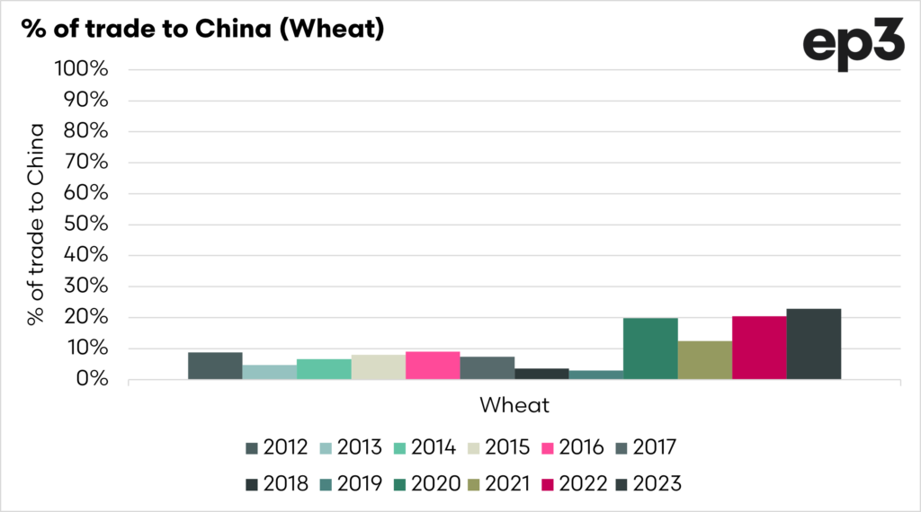 Let’s look at the overall picture, the chart below shows the % of our trade headed to China as an average from 2012 to 2023. China was a market for less than 35% of our trade for these commodities with the exception of sorghum, which was 82% of the total trade.