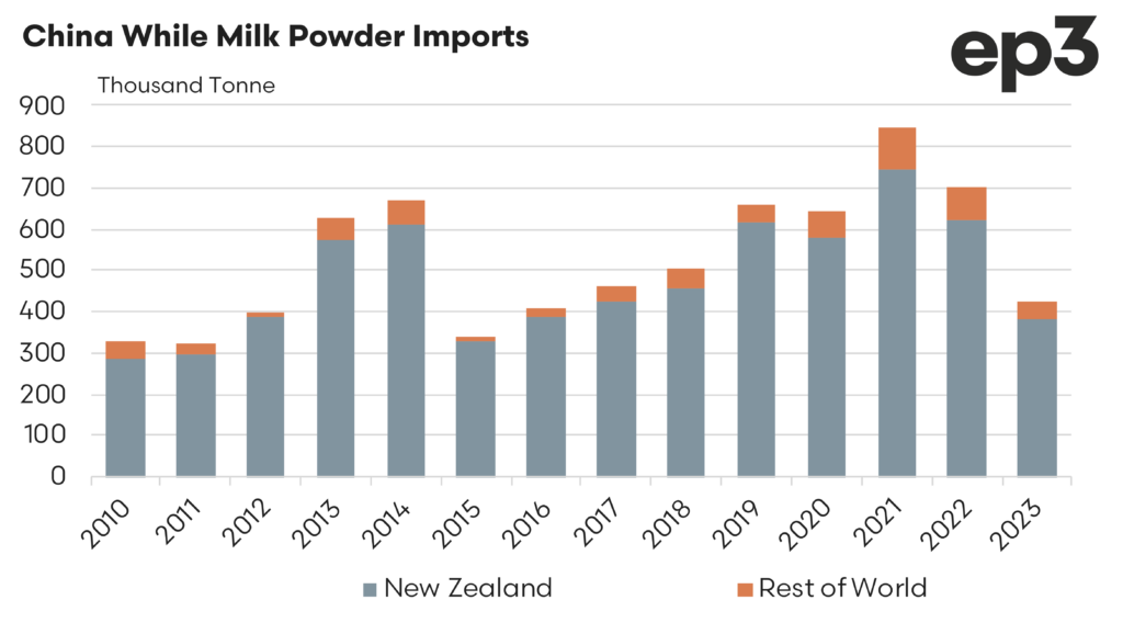 The country’s whole milk powder (WMP) imports plunged from an average of 820,000 metric tons in 2021 to a mere 430,000 metric tons in 2023. Most impressive from an internal supply of quality protein perspective…..bit rough on Aussie farmers who got used to budgeting on $2,000 plus for 200kg friesian heifers to the China live export market.
