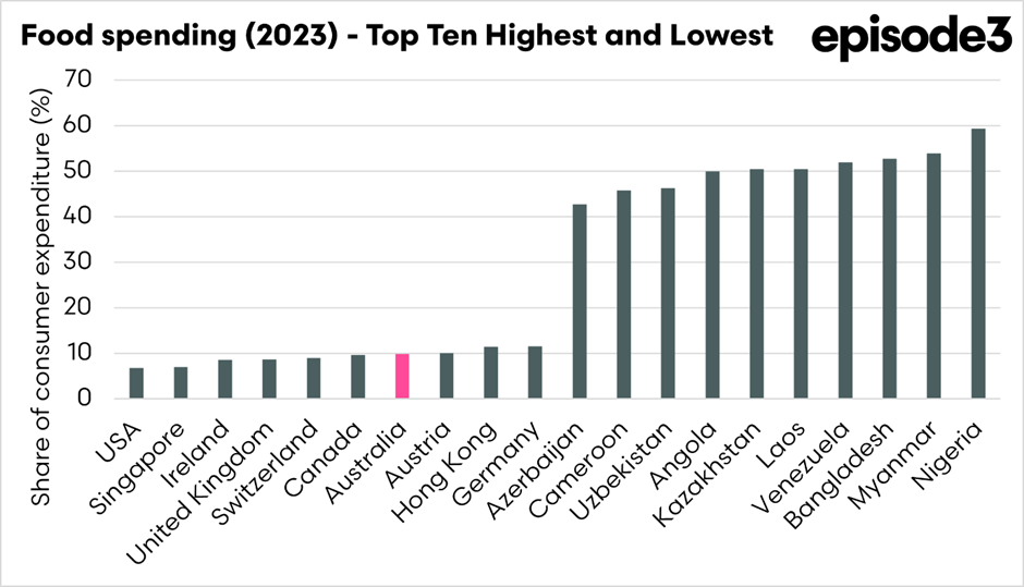 What people spend on food, alcohol, and tobacco tells a powerful story about how societies function and what people can afford. Looking closely at these spending patterns worldwide, Australia stands out as a country where relatively little of the household budget goes toward food. Food makes up just under 10% of consumer spending in Australia, which is low by global standards and places it firmly in the high-income category. Alcohol and tobacco spending is around 3.6%, meaning Australians spend more on lifestyle items like drinks and cigarettes than many people in lower-income countries can even dream of. The combined “essentials” spending on food, alcohol, and tobacco totals just over 13%.
