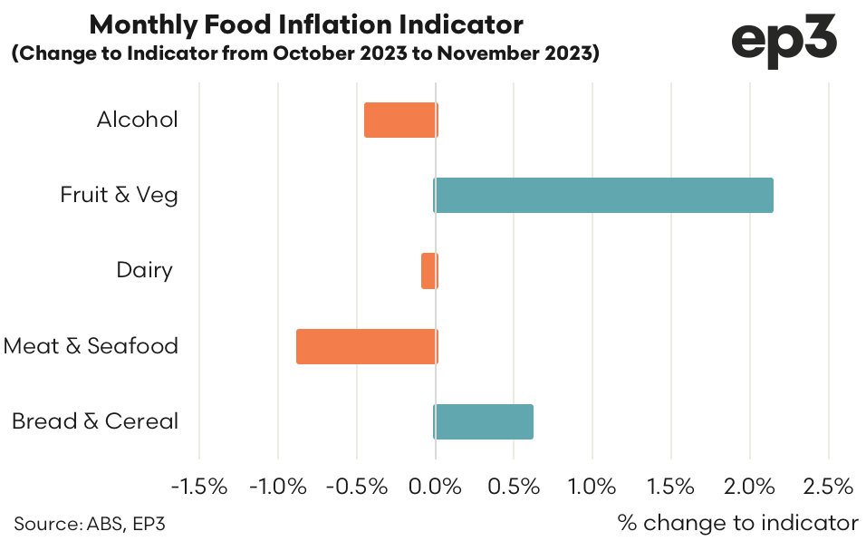 Although, it wasn’t good news across all food categories for consumers with Bread & Cereal prices up by 0.6% during November 2023 and the Fruit & Vegetable category showing the strongest inflationary gains in price of 2.1%.