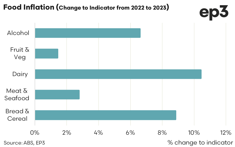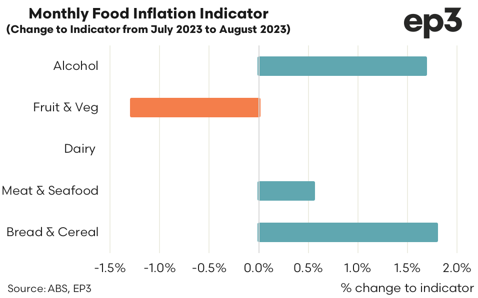 Price increases in the Dairy category abated and the monthly indicator showed no change from July to August. Meanwhile prices in the Meat & Seafood category increased by a meagre 0.6%, which is the same magnitude increase seen the month prior. Alcohol posted a 1.7% lift in prices during August. Meanwhile the Bread & Cereal category saw the highest inflationary pressures over August 2023, with an increase of 1.8% during the month.