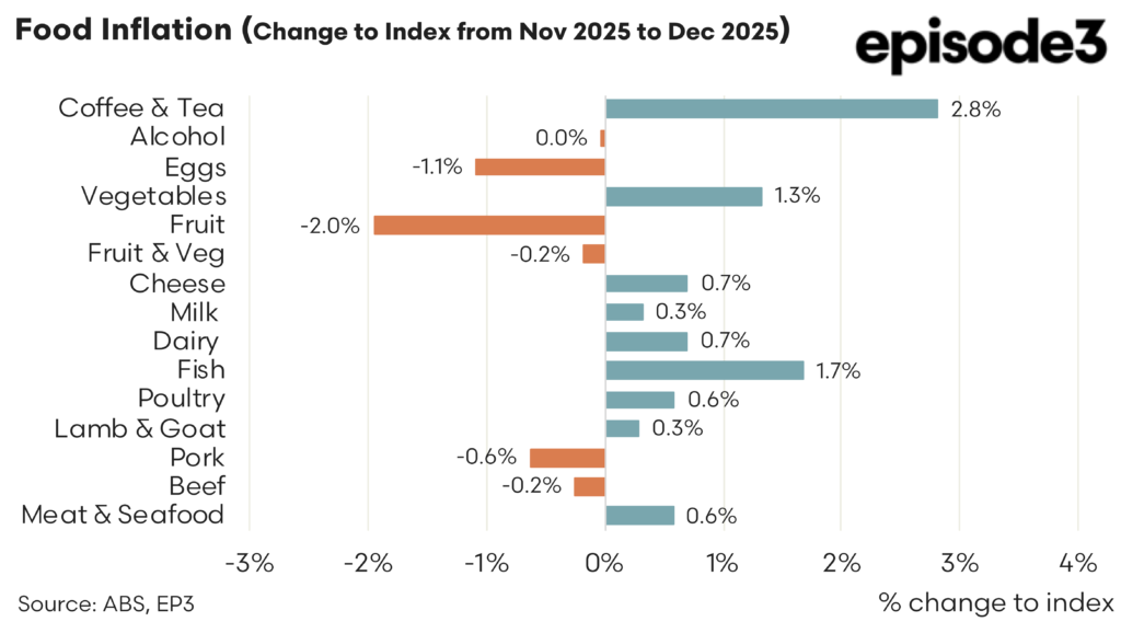 The monthly data for December tells a different but complementary story. Price movements into year end were mixed, with several categories easing after strong annual runs. Fruit prices fell 2.0 percent in December, pulling the combined fruit and vegetable category down by 0.2 percent for the month despite a 1.3 percent rise in vegetables. Eggs declined 1.1 percent month on month, providing some relief after sustained annual increases. Pork prices fell 0.6 percent and beef eased 0.2 percent, suggesting that short-term supply improvements and seasonal factors were beginning to temper meat prices as the year closed.