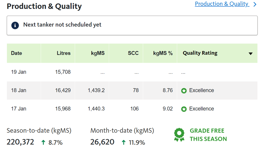 This is real time data we have on an App from Fonterra, SCC (Somatic Cell Count) the day after pick up alerting us to any possible mastitis spreading in the herd. Actual litres per day and trend data form month to month and year to year. And we can dig deeper into Milk Urea and Protein/Fat ratios among other things.