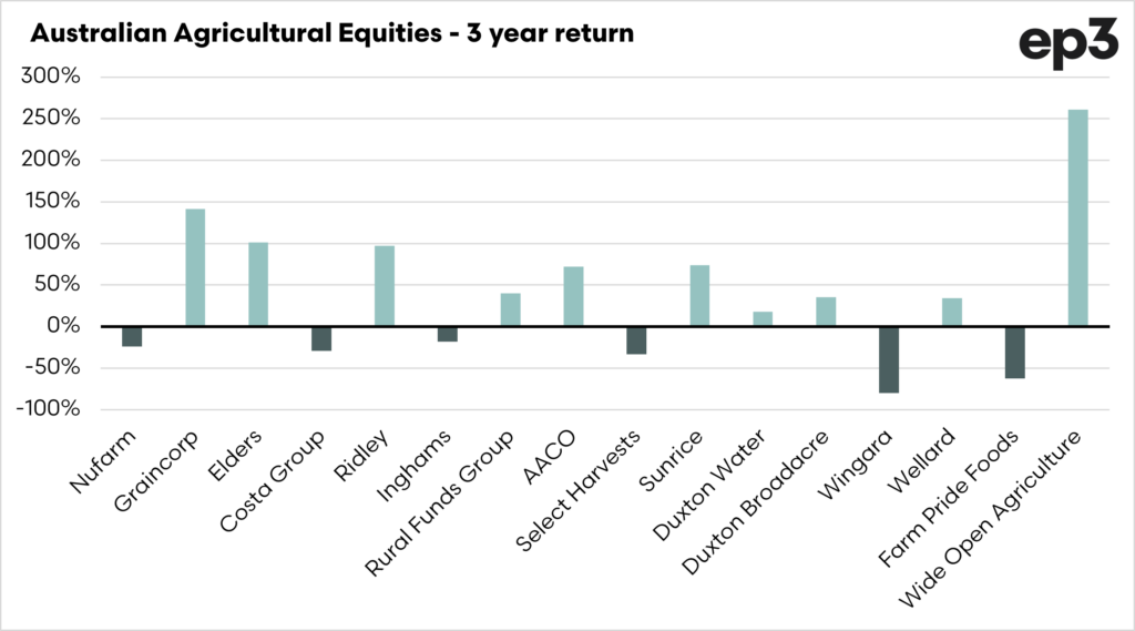 The chart above shows the 3-year returns on the selected ag equities; this doesn’t include dividends and is purely the share price change.