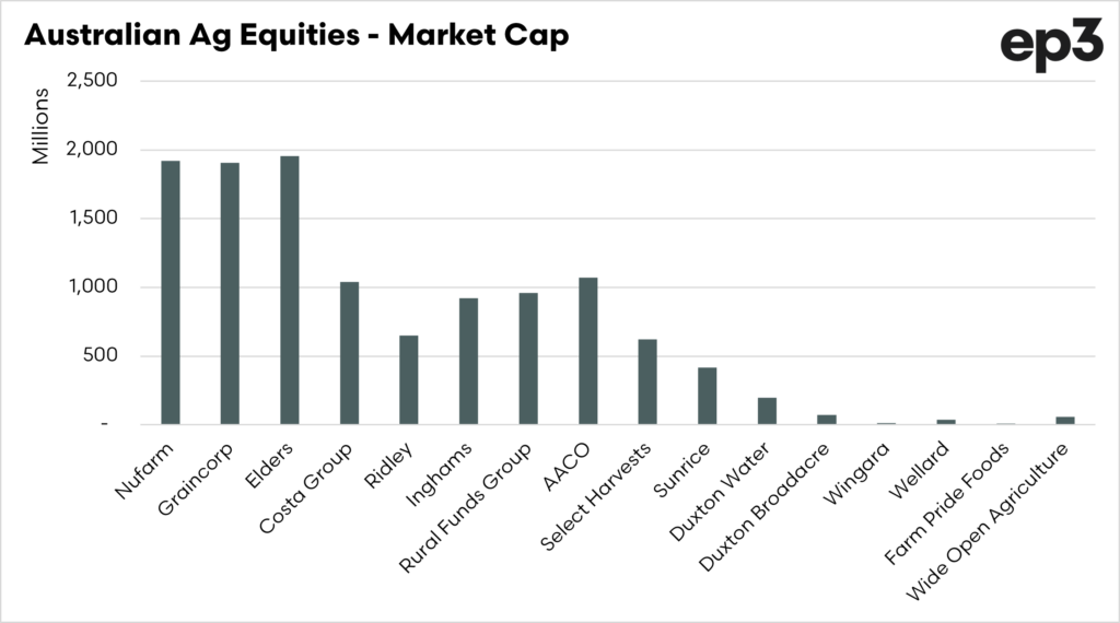 We can see that the behemoths are Nufarm, Graincorp and Elders, which are each close to the $2bn mark.