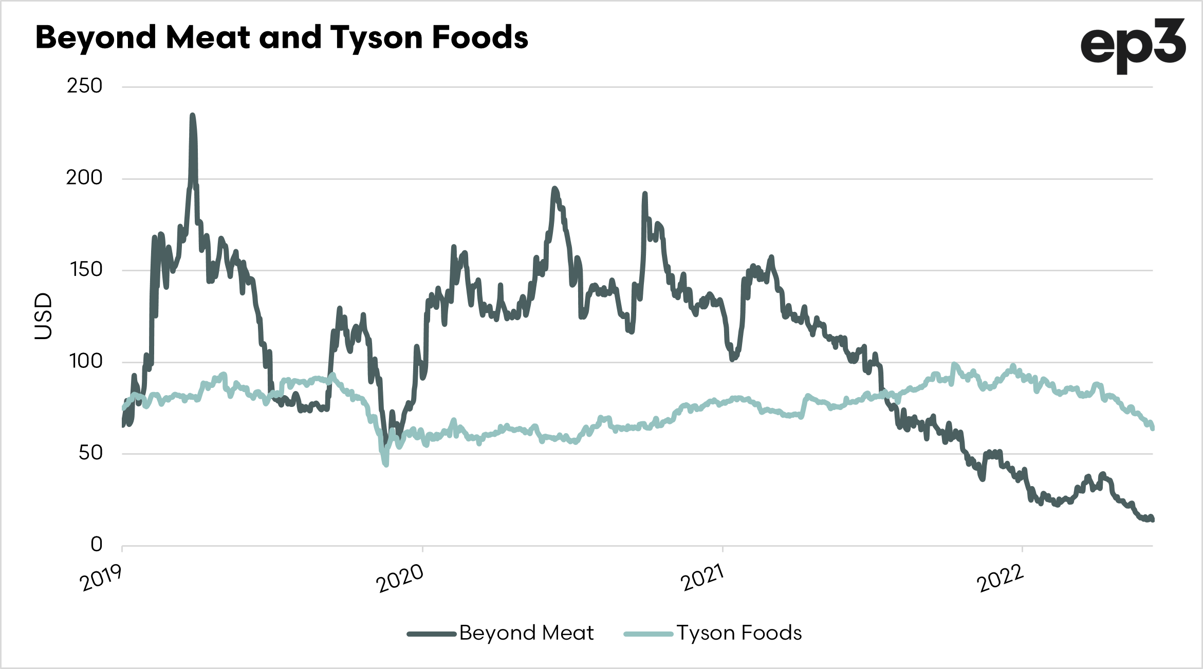 I have also overlaid Tyson Foods, one of America’s largest meat companies. If you invested in the Beyond Meat IPO you would have lost 79% if you held on; you’d have lost with Tyson as well but only 15%.