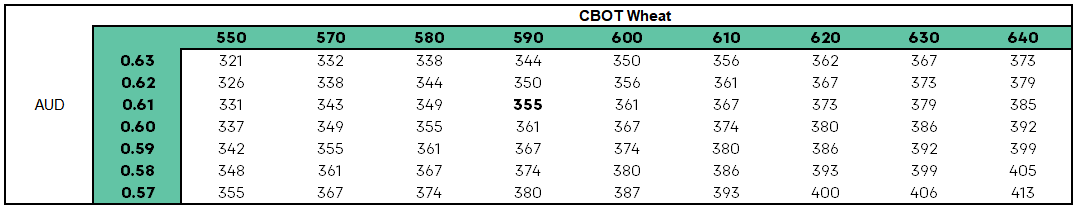 The table below shows the impact of the Australian dollar on the CBOT wheat values in Australian dollars as it increases and falls.