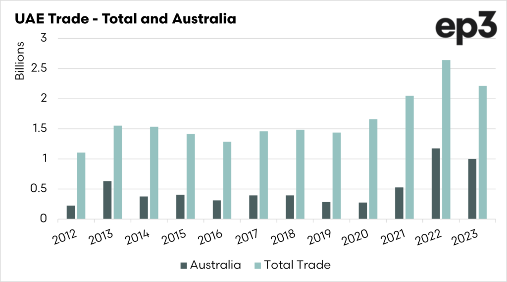 The important chart, in my view, is the second chart. This one shows the total trade and how much trade Australia has with the UAE.