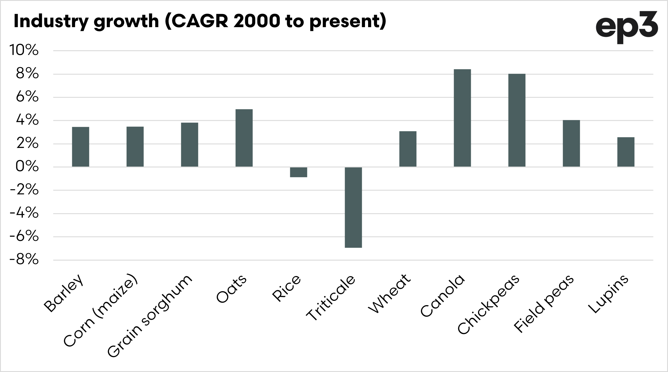 The grains industry has seen significant growth in value since the turn of the century. Most grains have seen value increases in excess of 100%.