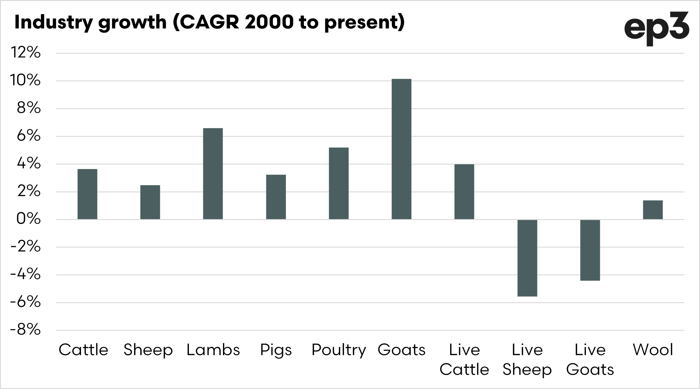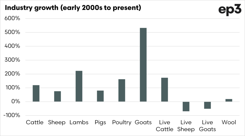 All industries in livestock have experienced value growth, except live sheep/goats. These two industries have seen large decreases.