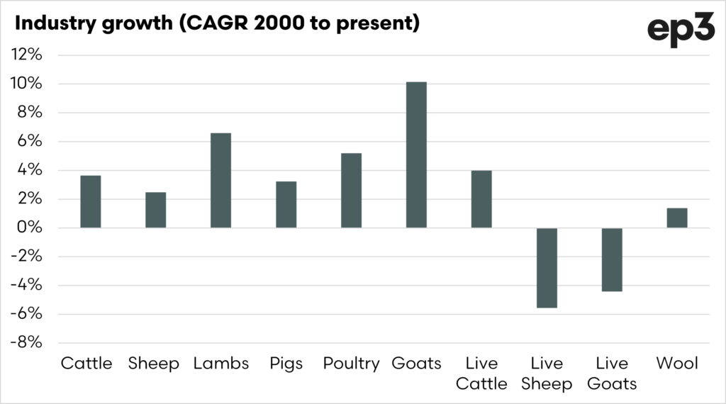 The wool industry has also been languishing in value. This might be attributed to the lower volumes being produced and sold. Still, since the turn of the century, the value has shown an average growth of 1%.