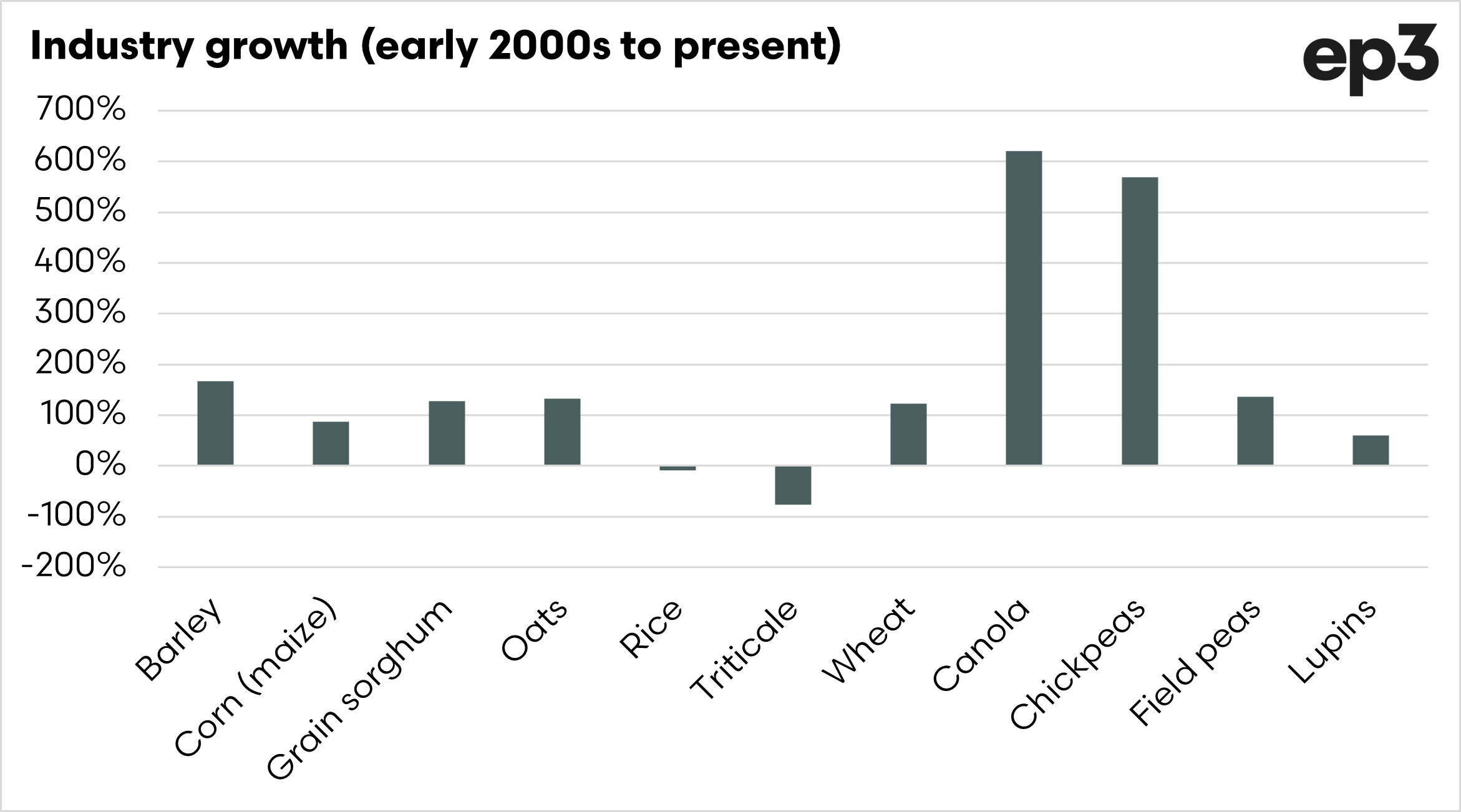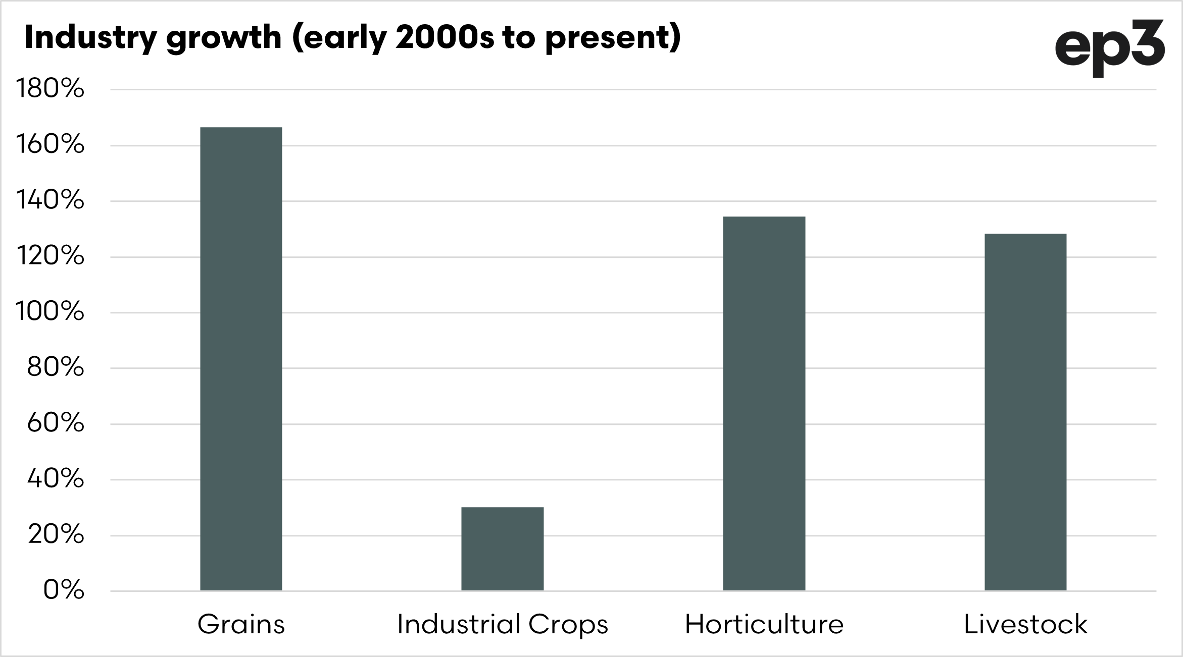 Suppose we distil down to the overall industries showing the most growth. In that case, grains are carrying the weight, with horticulture in second place. The livestock industry is a close bronze.
