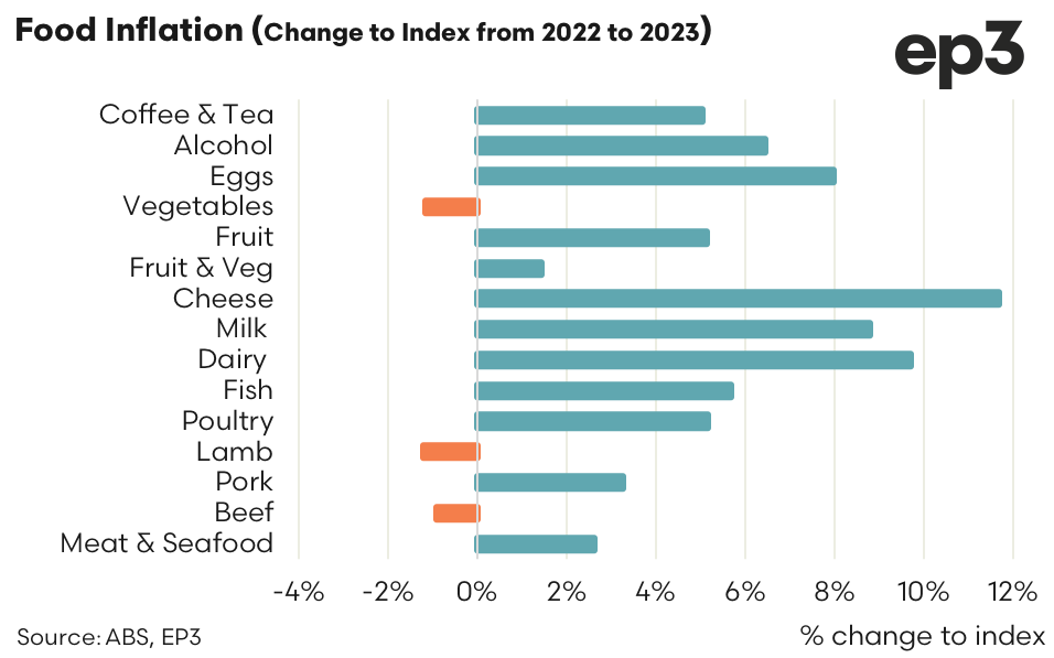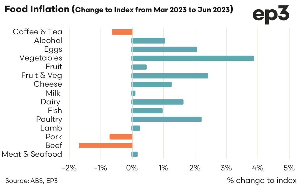 Within the meat sector, poultry was still firmly entrenched in an inflationary cycle, with the price indicator up by 2.2% from Q1 versus Q2. Staying in the inflationary feathered space, the price indicator for eggs was also up by 2.0%. However, the standout for food inflation over the June quarter was the vegetables category with a 3.8% lift in its price indicator.