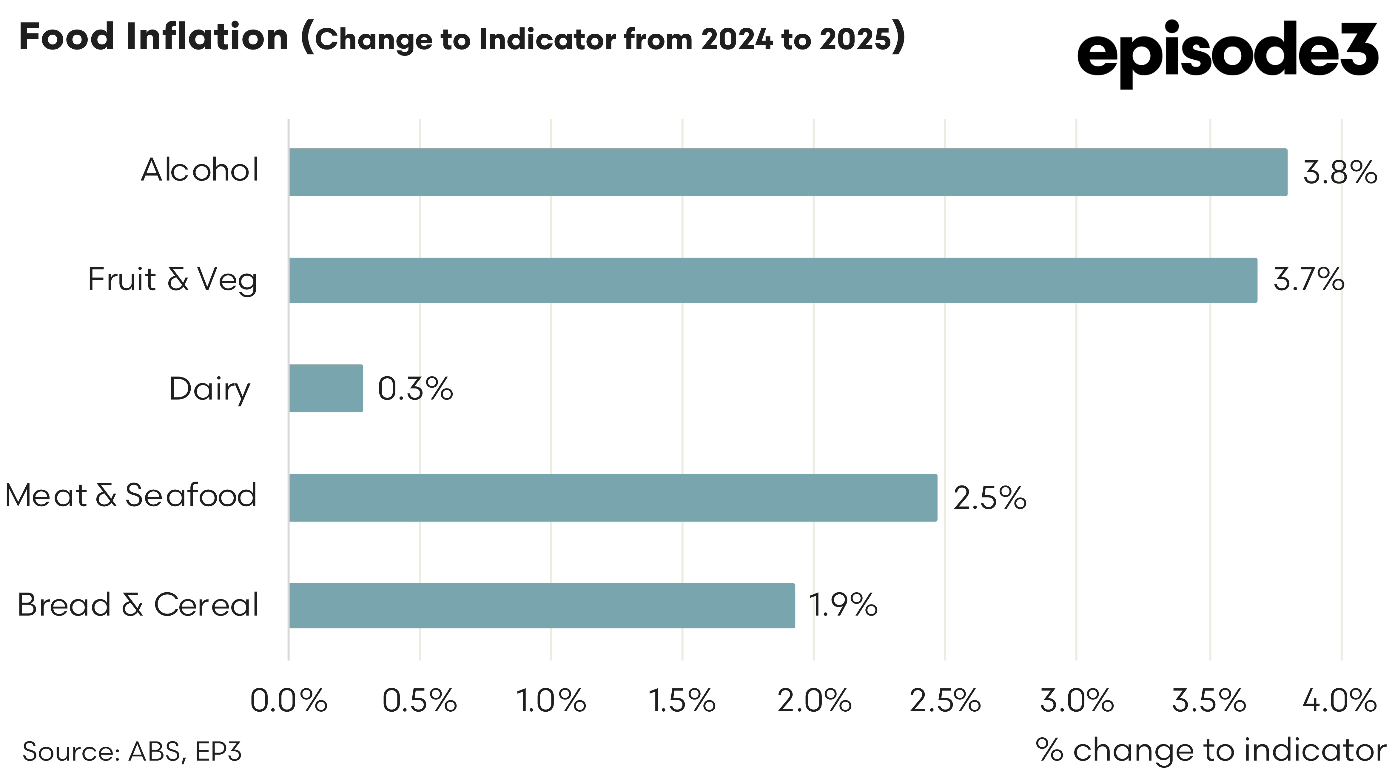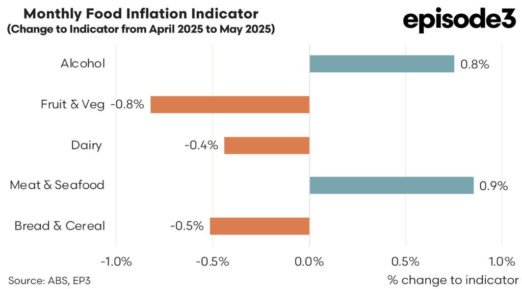 Looking at the broader picture, annual food inflation from 2024 to 2025 highlights a continued upward trend across nearly all major categories. Alcohol leads with a 3.8% increase over the year, followed closely by fruit and vegetables at 3.7%. Meat and seafood recorded a 2.5% rise, while bread and cereal prices climbed 1.9%. Dairy prices showed the smallest annual movement, up just 0.3%, confirming the subdued month-to-month pattern observed in May.