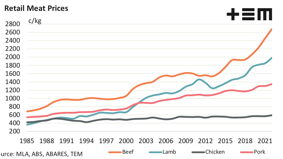 The first quarter CPI for March 2022 shows retail beef now sits at an average price of $26.76/kg, retail lamb is at $19.83/kg, pork at $13.48/kg and chicken comes in at $5.89/kg.