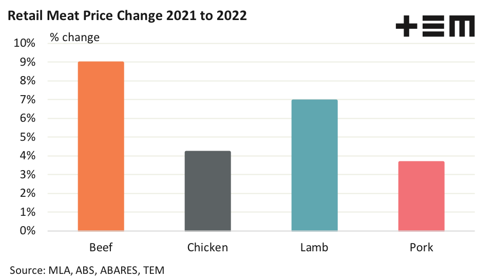 A percentage change comparison from this year’s pricing to last season highlights that beef is leading the way higher in the meat sector. Current beef prices have gained nearly 9% from 2021 levels and lamb has managed a lift of almost 7%. Chicken prices have increased 4.2% from last year and pork has been the most resilient to inflationary pressures, up by just 3.6%.