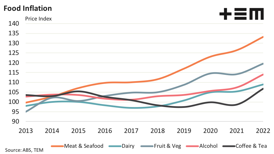 A selection of other food and beverage price indicators shows that meat products have been exhibiting the most inflationary pressures over the last decade. The meat & seafood category has increased by more than a third from levels seen in 2013. Fruit & vegetables have also shown significant price pressure with the index lifting by just over a quarter over the last decade.