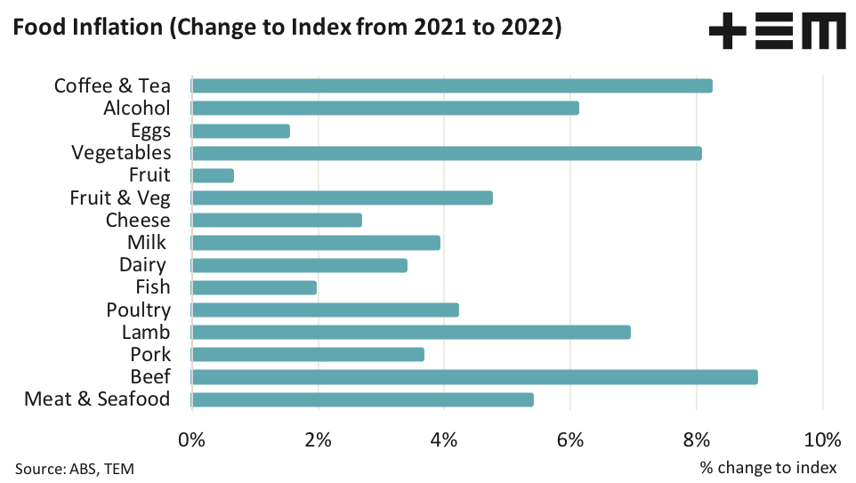 The first quarter Consumer Price Index (CPI) data was released today for 2022 and it highlights some strong price gains across multiple food and drink categories. In the retail meat segment all four main meat items of beef, lamb, chicken and pork have seen increases to retail price levels from 2021 values. Last year retail beef averaged prices of $24.56 per kilogram. Meanwhile it’s red meat competitor, lamb, was averaging retail prices at $18.54/kg. In the white meat space, pork prices averaged $13.01/kg in 2021 and chicken was the value buyers choice at an average retail price of just $5.65/kg.