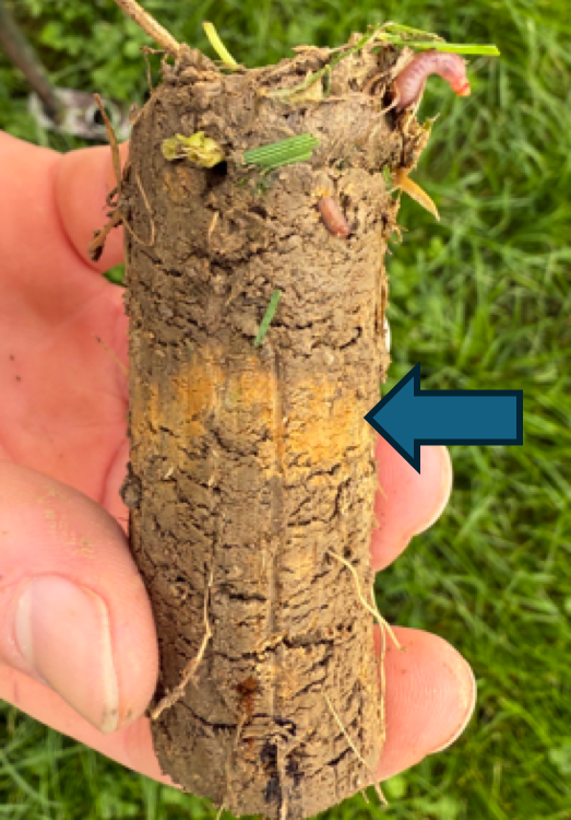 Fertiliser programs nowadays normally keep farms using less than 200kg of nitrogen/ha/year and its common knowledge that maintaining your pH at 6-6.5 unlocks a lot of minerals already in the soil. At these levels I’m yet to see poor soil structure, some pugging with the 10cm soil plug below showing ‘mottling’ where an Iron pan can form after cropping or hoof pugging after extreme wet conditions, temporarily impeding roots going deeper, with good management and often mechanical aerating the soil does heal itself.