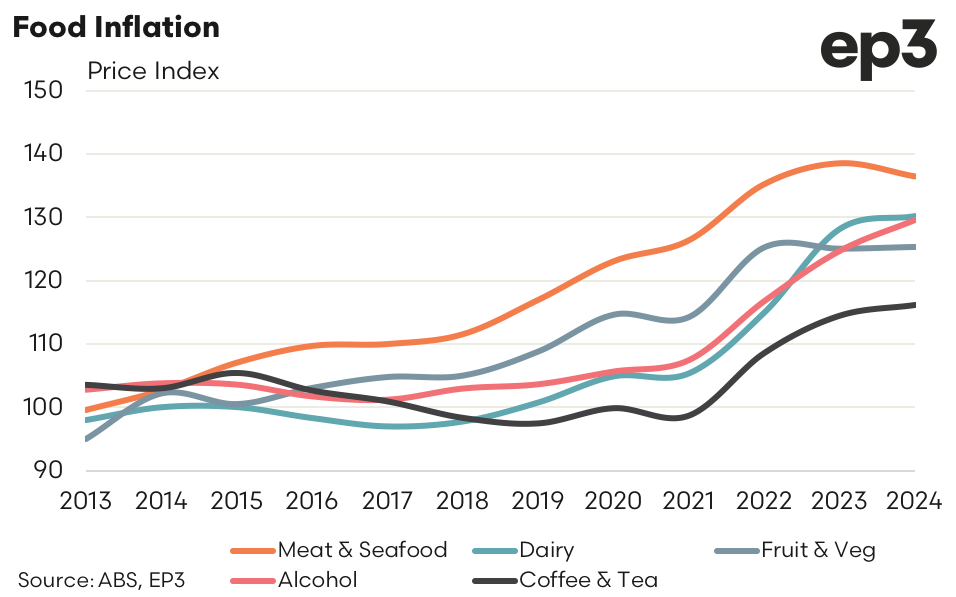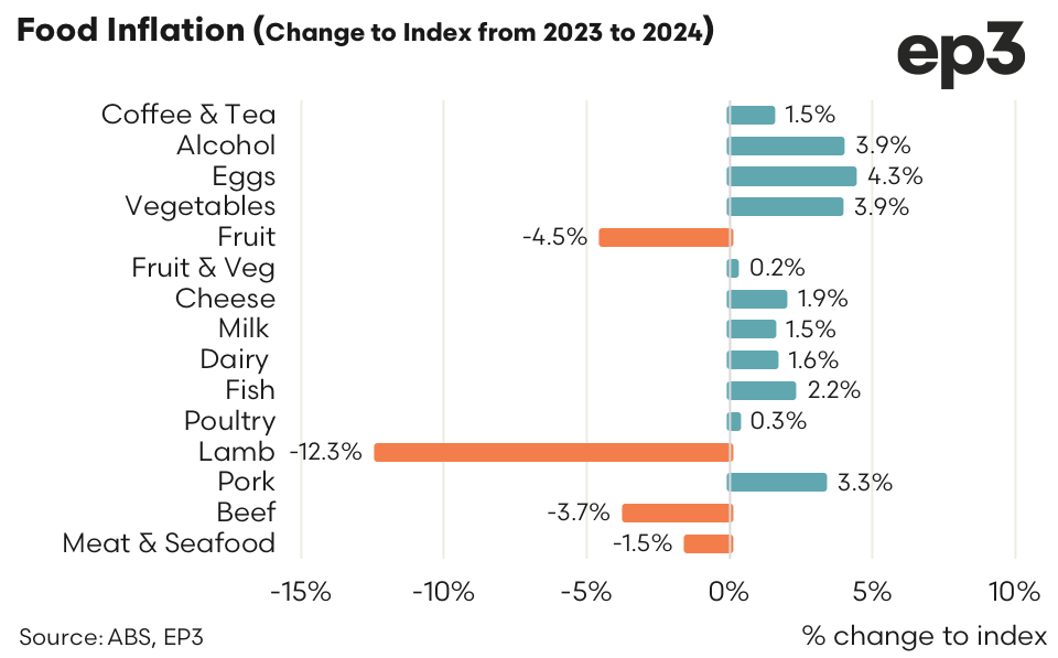 On an annual basis, comparing the average indicator for 2023 to the 2024 indicator highlights that only the Fruit, Beef, Lamb and Meat & Seafood categories have seen a deflationary trend favouring consumers. Lamb is leading the charge down with a solid 12.3% drop in pricing. On the flip side most other food categories saw annual price gains of between 1%-4%, with eggs the most inflationary at 4.3%.