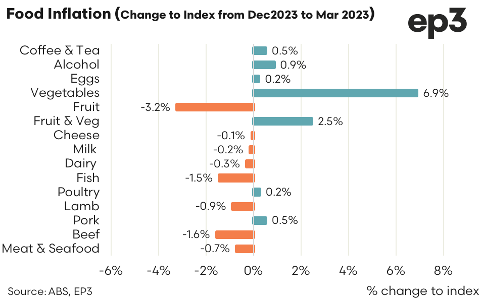 The quarterly update to inflation was released yesterday by the ABS and this quarterly data gives us more insights than the monthly update provided, as the ABS cover more food categories in detail. Looking at the indicator changes from the last quarter of 2023 to the first quarter of 2024 shows that the Fruit category showed the most price relief with a 3.2% fall in prices over the period. Fish and Beef were also down (reducing by 1.5% and 1.6%, respectively) to bring the combined Meat & Seafood category prices down by 0.7% over the quarter.