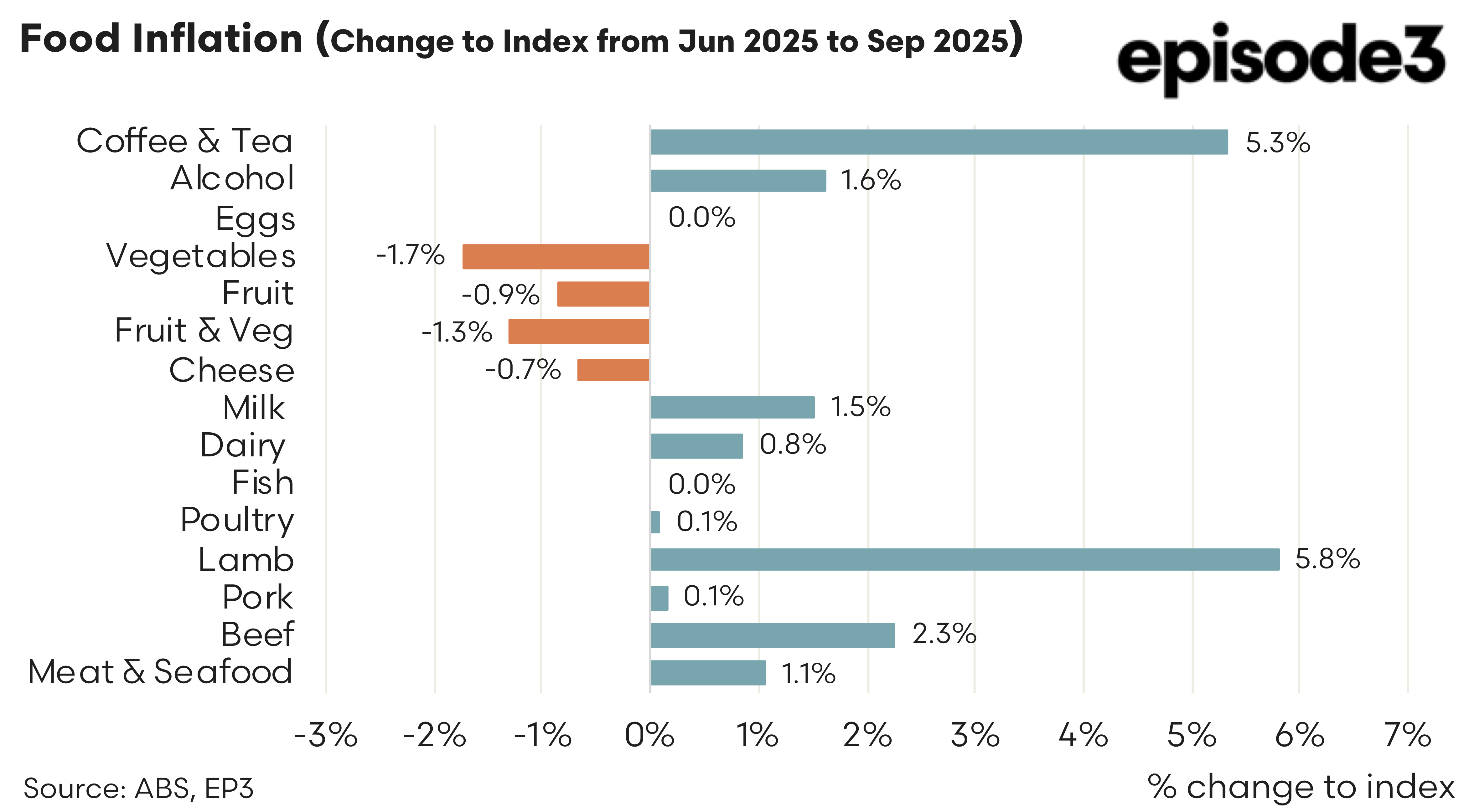 In contrast, some categories edged higher. Coffee and tea rose 5.3% over the quarter, reflecting higher global coffee bean prices and currency-related import pressures. Alcohol gained 1.6%, while milk was up 1.5%, and beef rose 2.3%. Lamb jumped 5.8%, a continuation of seasonal shifts and tighter livestock supply conditions in the domestic market. Most other proteins were steady: poultry +0.1%, pork +0.1%, fish unchanged. Overall, the quarterly data show a mild easing in produce prices but an upswing in meat and beverage categories.