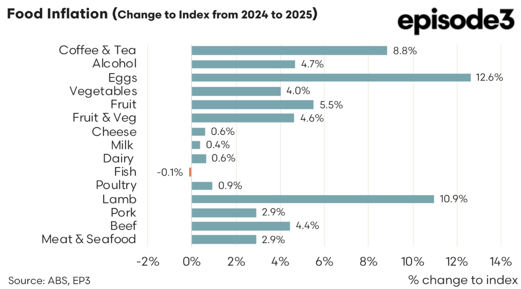 These figures paint a picture of divergence with consumers paying far more for eggs, lamb, and café-style items such as coffee and fruit, while staples like milk, cheese, and fish remain relatively steady.