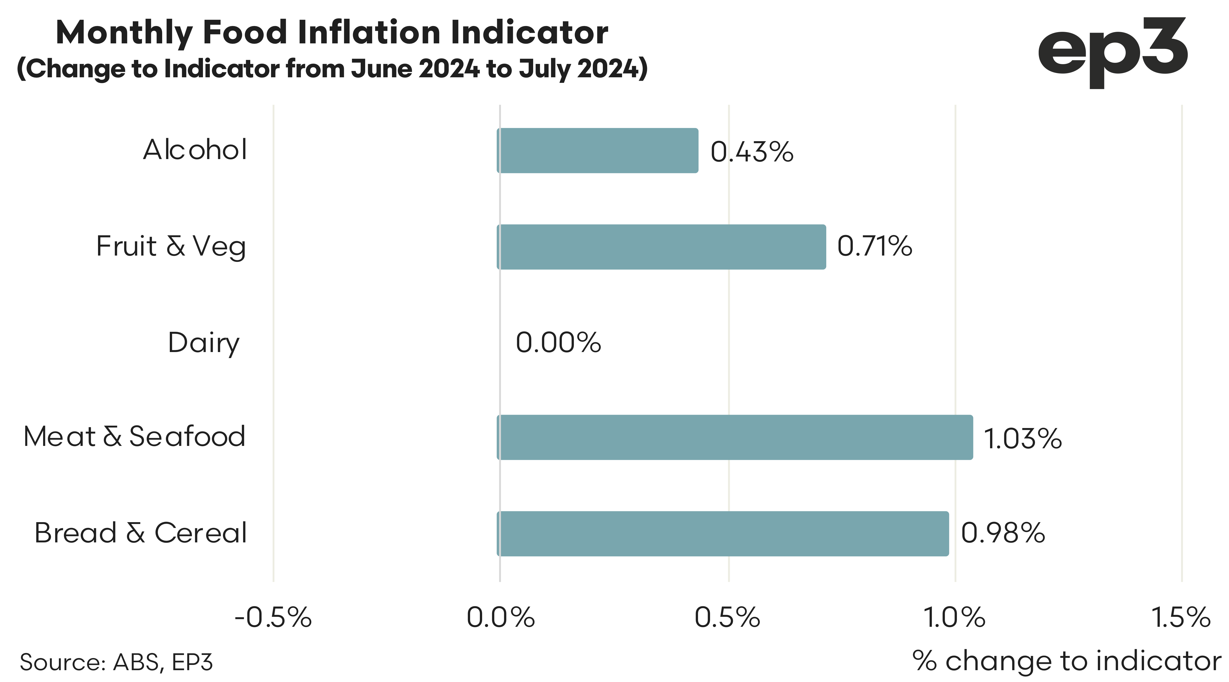 The release of monthly consumer price data this week shows that on a monthly basis, reported food categories saw incremental increases in prices. Meat & Seafood saw the largest monthly gains, but only a 1% increase. The Bread & Cereal category was up by similar levels, followed by Fruit & Vegetables (up 0.71%) and Alcohol up by just 0.43% over July 2024. The Dairy category recorded no change.