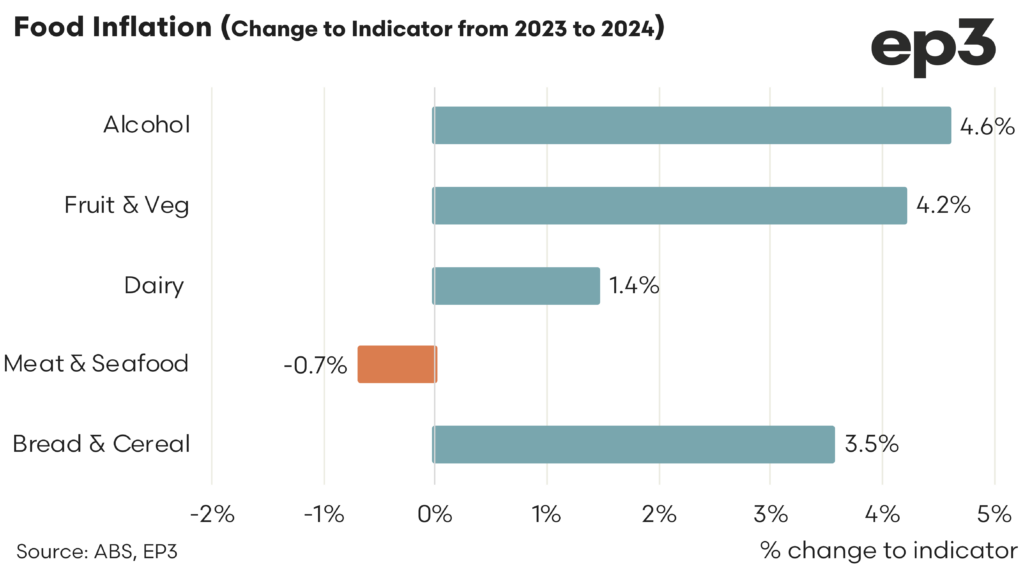 CPI levels on an annual basis, comparing 2024 average price gains to 2023 levels, shows that inflationary trends persist for all reported categories with the exception of Meat & Seafood, which saw price declines of just 0.7% from last year’s figures. On the annual measure Alcohol continues to show the most inflationary pressures with prices up by 4.6%, followed by the Fruit & Vegetable category on a gain of 4.2%.
