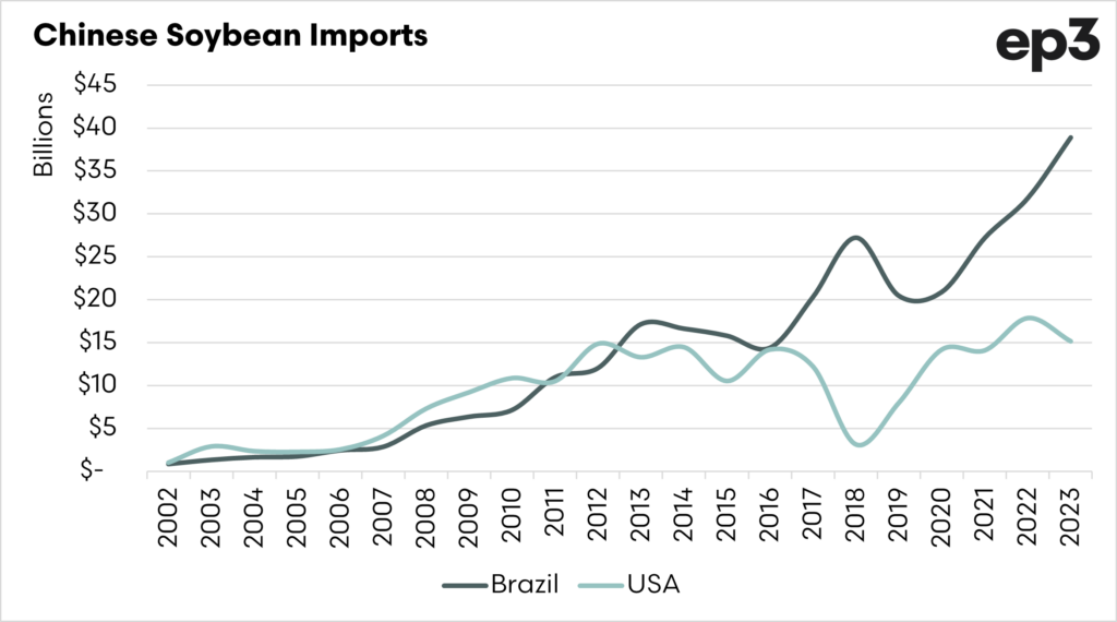 - China changed its trade flows from the US to Brazil for soybeans when a 25% tariff was introduced.