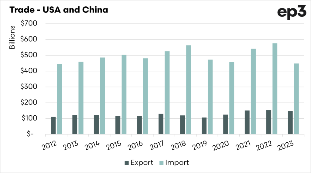 The chart below shows the trade in all goods and services between the USA and China. Therefore, China is the more significant exporter to the USA and has more to lose.
