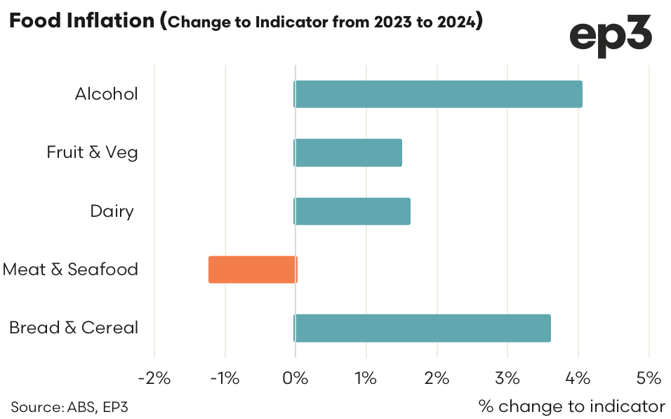 Monthly consumer price index indicators (CPI) were released today and they show that the Meat & Seafood category is the only one to post a deflationary trend on an annual basis. Compared to the average indicator for 2023 the current 2024 indicator for meat & seafood prices are 1.2% cheaper. All other reported categories are still showing an inflationary cycle on an annual basis with the Fruit &Vegetables category and Dairy category up by 1.5% and 1.6%, respectively. Alcohol and Breads/Cereals are still running above the Reserve Bank’s CPI target inflationary range sitting on 4.0% and 3.6% price growth each.