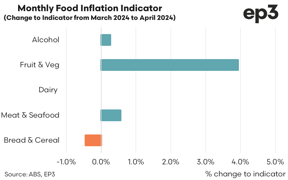 On a month to month basis the picture is a little different. Looking at price changes from March 2024 to April 2024 the data shows that Bread & Cereal prices are beginning to ease marginally, down by 0.4% over the month. The Dairy category is unchanged. Meanwhile, the Meat & Seafood category lifted by 0.6% and Alcohol is up by just 0.3%. Leading the monthly price gains is the Fruit & Vegetable sector with a rise of 3.9% over April.