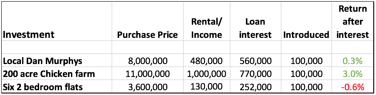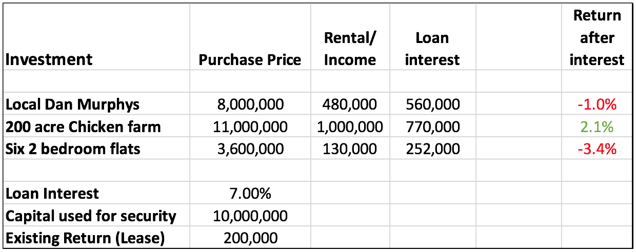 Now because our initial form of security was a $10 million farm returning 2% or $200,000 let’s flog half this to assist in the new investment as it’s 100% leveraged…..this happens.