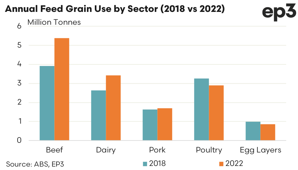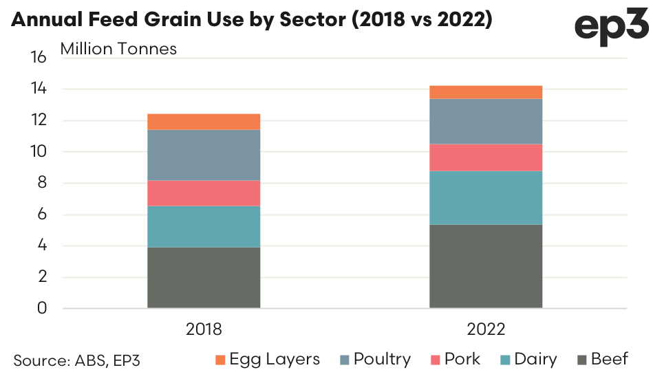 - The beef feedlot industry has seen the biggest increase in feed demand since 2018 with a 37% lift in volumes to 5.4 million tonnes in 2022.
