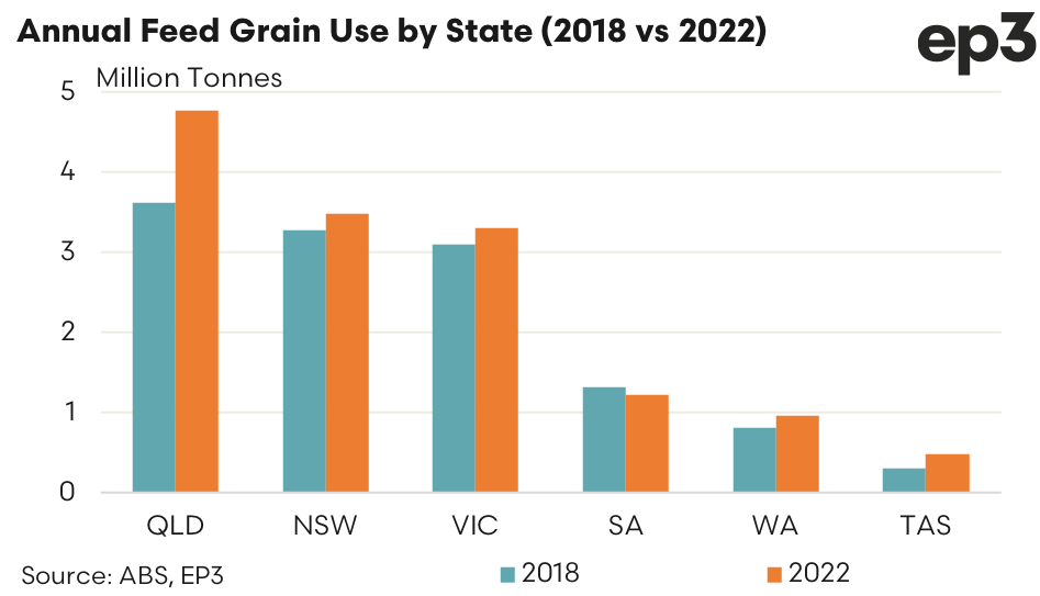 The high concentration of beef feedlot operations in Queensland and the strong lift in beef feedlot demand for grain from 2018 to 2022 have underpinned the increase in total feed demand across all sectors with volumes increasing 32% from 3.6 million tonnes to nearly 4.8 million tonnes. At this level total feed demand in Queensland represents 34% of the national demand volumes.