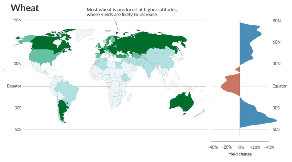This graphic from the article How will climate change affect crop yields in the future? attempts to predict how global warming will affect wheat yields between now and 2050. Wheat is the number one crop grown in the world, the green areas on the left show the regions benefitting and the blue/red graph on the right shows the yield changes at the different latitudes.