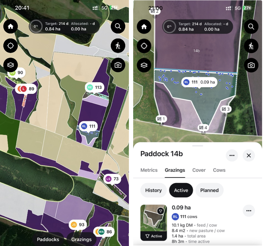 Below are iPhone screenshots showing the 8 mobs, and a close up where you can see the individual cows as blue dots, the thin blue line is their next break and behind them we have back fenced to avoid more pugging but left trough access.