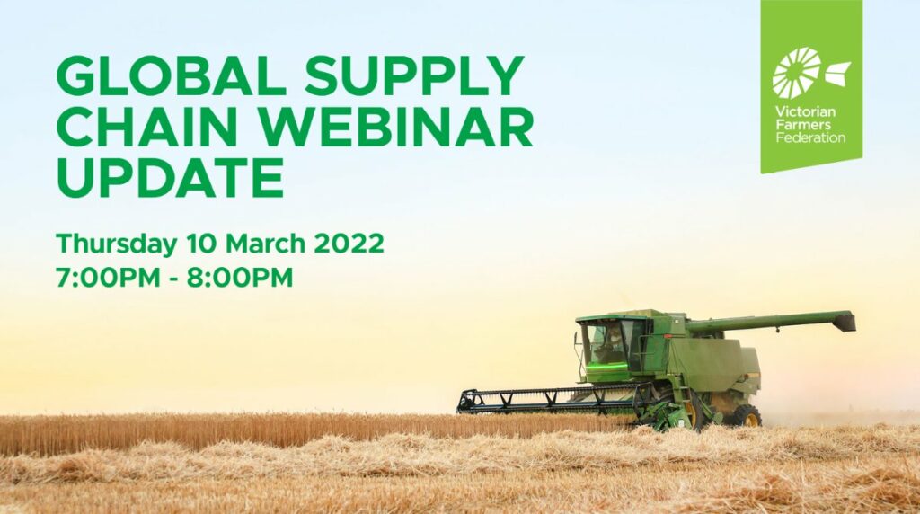 The Victorian Farmers Federation has invited me to present a webinar on the impact of the conflict in Ukraine on Australian agriculture. This event will be held on Thursday evening 7pm to 8pm (Vic time).