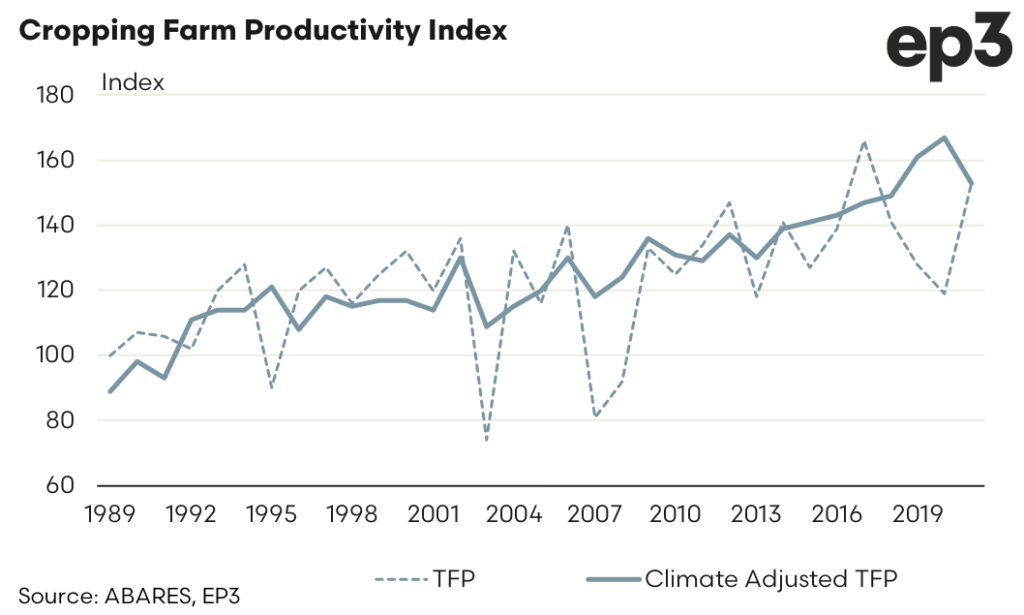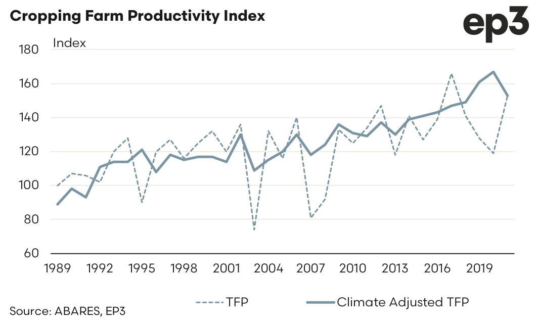 ABARES offer both climate adjusted and conventional productivity data for analysis. Interestingly, a comparison of the climate adjusted productivity trend to the non-adjusted data shows that for cropping enterprises productivity levels are more sensitive to climatic factors such as drought, frost and floods than livestock enterprises.