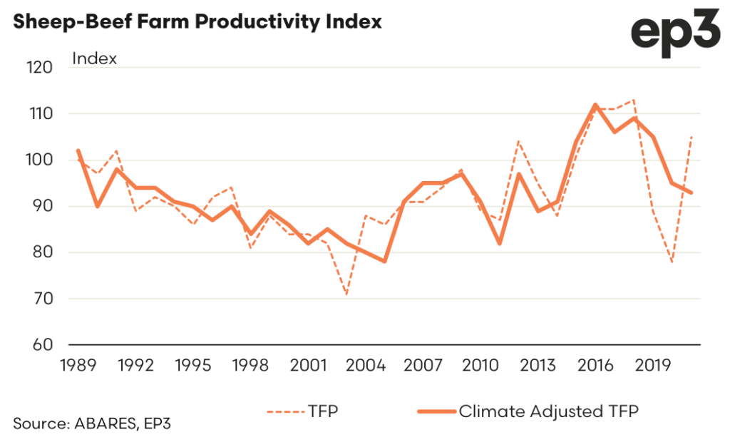 It appears that the ability to de-stock during drier times allows livestock farmers to moderate their productivity losses. However, despite this ability to respond more flexibly to climate, across the last three decades productivity on livestock enterprises hasn’t exhibited anywhere near the same growth as cropping.