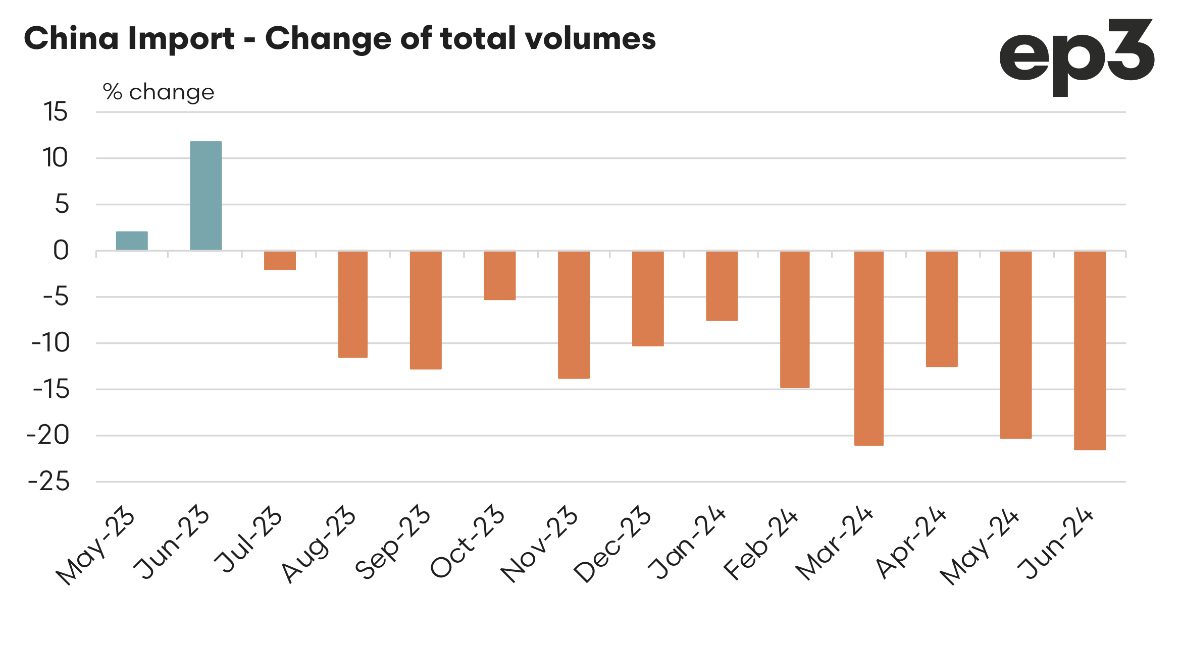The graph below shows Chinese dairy import demand for each month compared to a year ago, from all source countries supplying China and a negative trend is clearly evident. A flat GDT with $8 plus milk price is actually quite positive considering the historical reliance on China. Interestingly as Episode 3 alluded to earlier, sheepmeat exports to China have experienced a similar drop in demand in recent months.