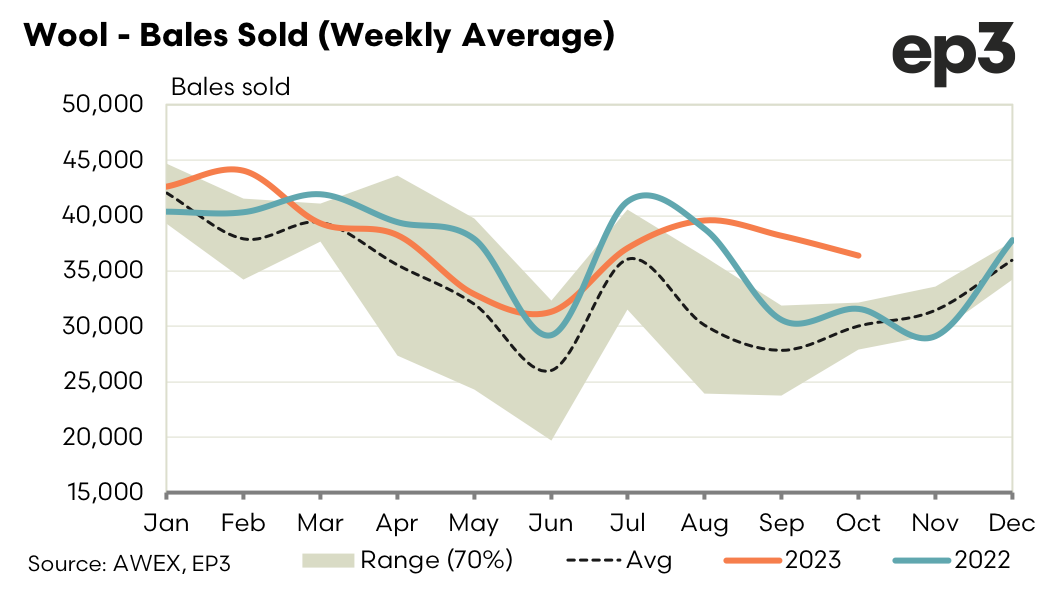 The forwards, which have endured low turnover and interest throughout the decline, bounced back with solid bidding across the board. Growers for the most part have shunned the forwards during the downturn. Volumes have remained under 1% of auction turnover for the last 6 months as growers were reluctant to accept bids at discounts to the spot market. Bids this week have lifted to be level with cash out to the end of November. The only trades this week occurred in 21.0 micron which traded early, mid, and late November at 1325 (a 2% premium to cash).