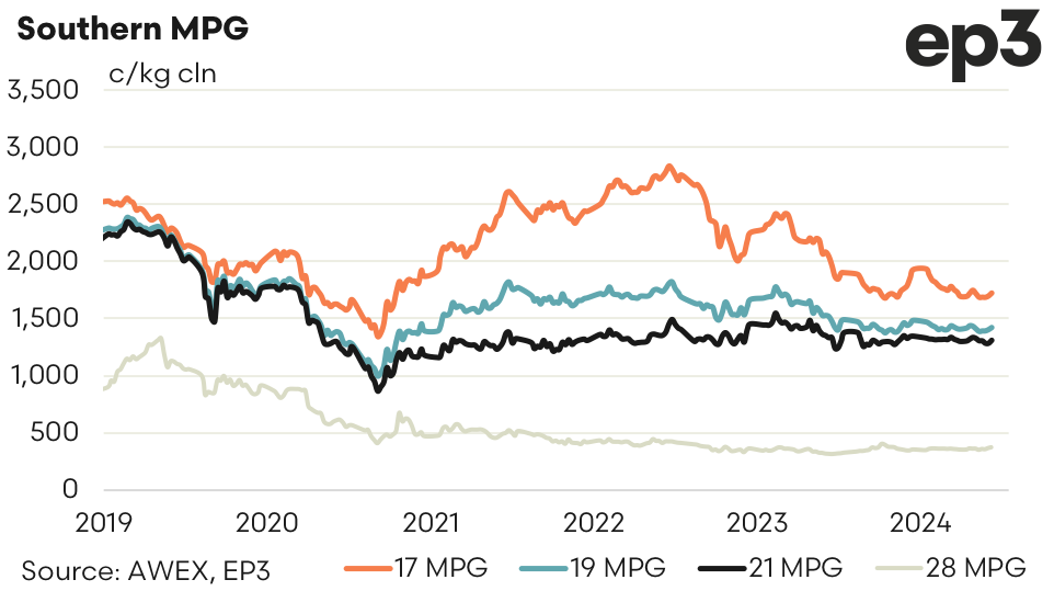 The forward market had a limited lift reflecting the “just in time” nature of export market at present. Strong forward indications had been restricted to the latter part of 2025 into 2026 and 2027 where premiums of around 100 cents to spot are offered. This week’s trades focused on the early part of the new season out to December 2024. 19.0 micron traded December at a 1460 (a 40-cent premium to cash) and 19.5 traded September at 1415 (a 30-cent premium). These trades triggered grower interest which saw limited offers posted at similar premium levels for 19.0 and 19.5 from July to December. These offers have yet to generate further action from the exports and processors indicating the concerns around medium term consumer confidence and the geopolitical situation. Notwithstanding the restrained volume the trading did highlight the importance both buyers and sellers having levels in the market to give all participants in the pipeline, if not certainty, an indication of future direction.